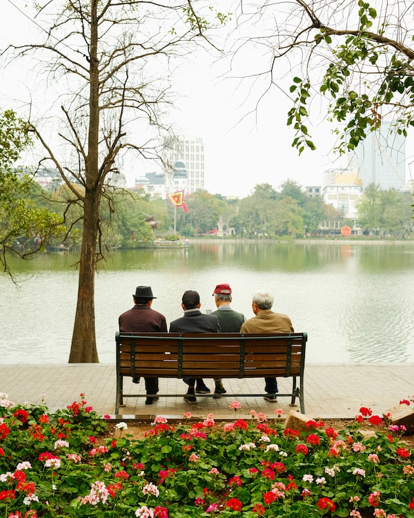 Four men sit on a park bench beside Hồ Hoàn Kiếm (Hoàn Kiếm Lake) in Hanoi, Vietnam.