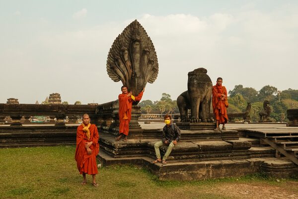 Buddhist monks pause for a photo in the temple complex at Angkor Wat, Cambodia.