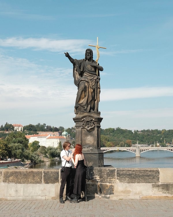 A young man cleans the face of a woman on Charles Bridge in Prague, Czech Republic.