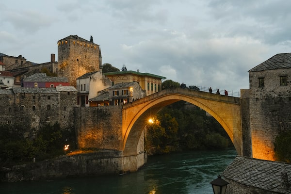 People walk across and take pictures of the historic Stari Most (Old Bridge) and the river Neretva in Mostar, Bosnia and Herzegovina.