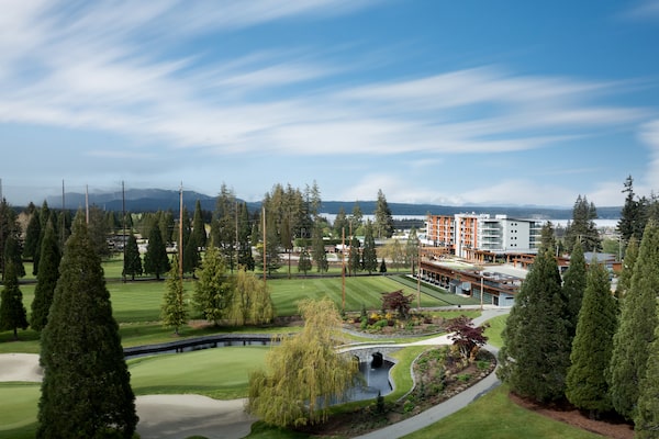The resort has an indoor pool and outdoor hot tub, with the public Campbell River Golf Club surrounding the five-storey property.