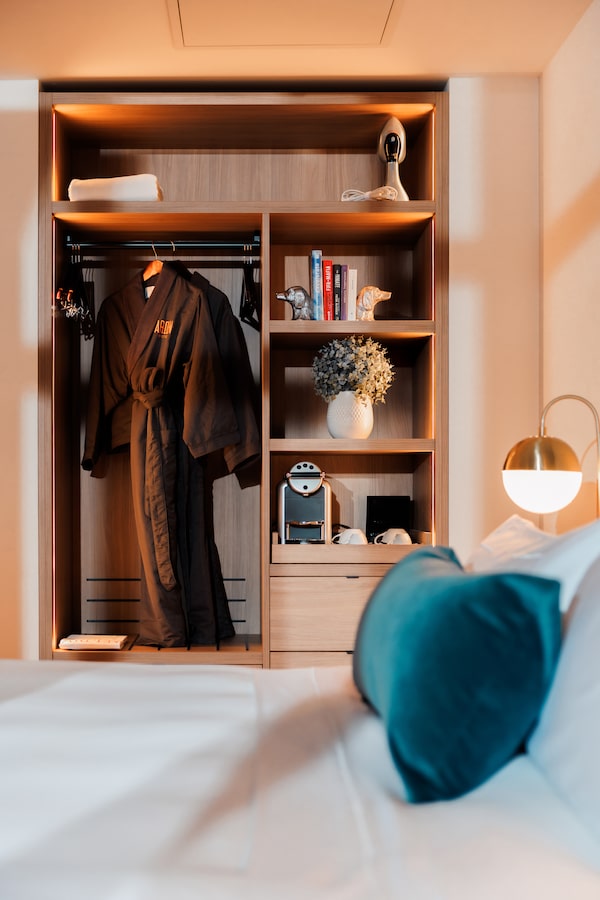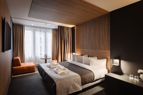 The art-forward common areas at Sonolux give way to comfortable guest rooms.Sonolux