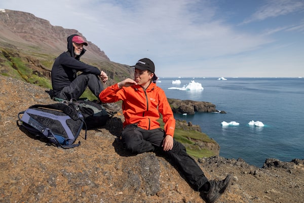 Intrepid Guide Niels Arkaluk Heilmann, in orange, tells stories during a rest on Disko Island.Intrepid Travel/Supplied