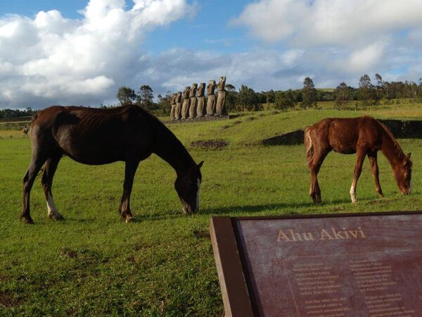 Horses, originally introduced by 19th-century Catholic missionaries, now roam freely on this Chilean-ruled island in the middle of the Pacific Ocean. But all are branded and owned by someone. And the horses have the bad habit of scratching themselves on the moai – the stone walls at major archaeological sites such as Ahu Akivi can't keep them out.