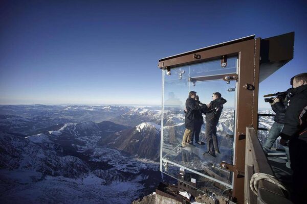 The Step into the Void skywalk in Chamonix lets visitors hang over the mountains in a glass box