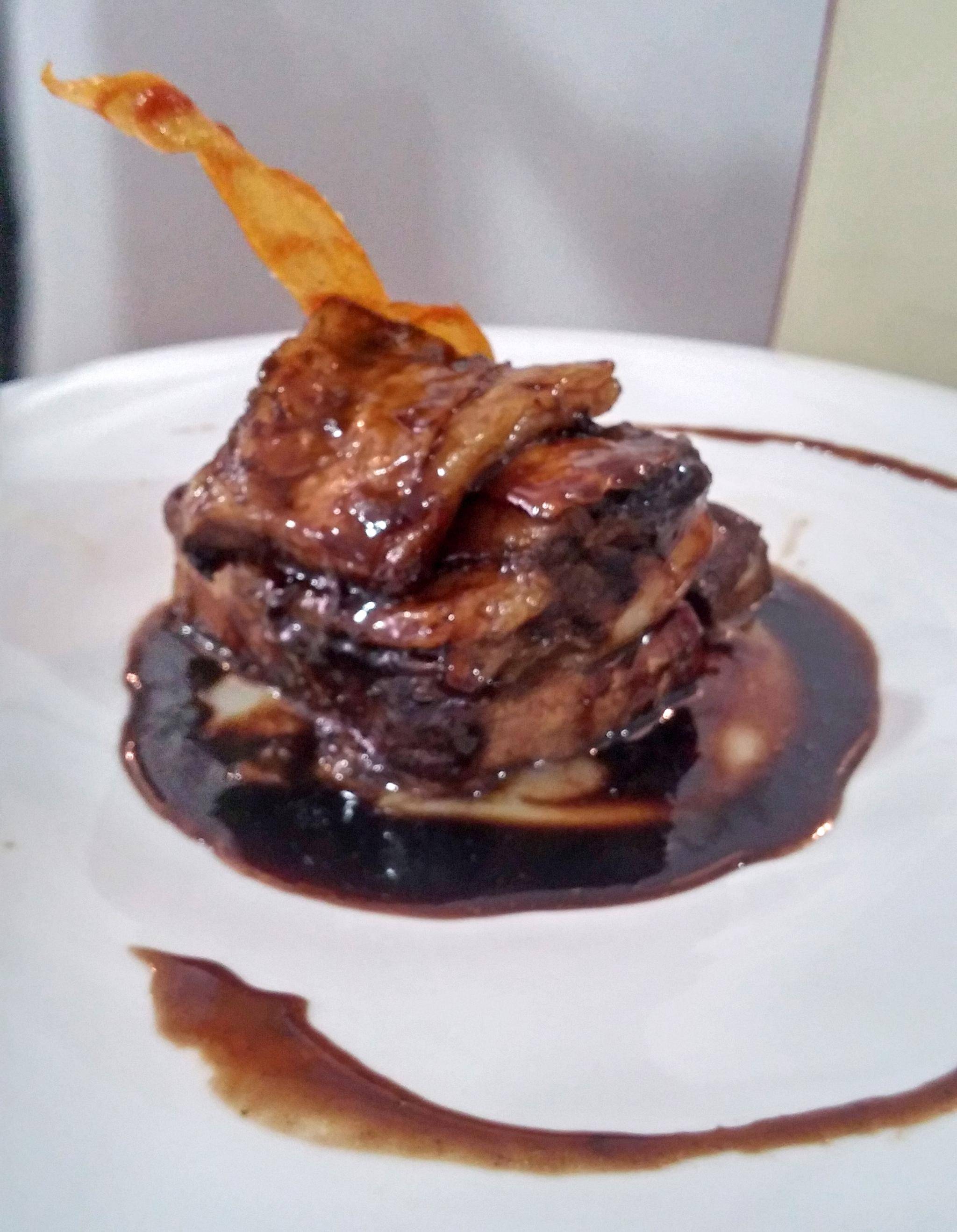 As this is the land of the Iberian pig, no meal would be complete without a sampling of the star local attraction. They say that everything on the hog is good and here the saying came true with a dish of Iberian pork cheek glazed in red wine and dark honey from the Hurdes mountain range just north of here. Modern cooking techniques have reduced the cooking times of these traditional recipes and the meat no longer needs to be slow-cooked and watched over for 12 hours. This was served with locally sourced wild mushrooms, amanita ponderosa, that can only be found during the spring.