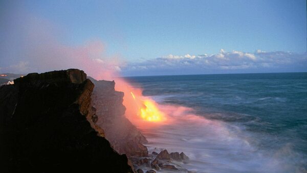Lava from Kilauea Volcano meets the sea, Hawaii Island.