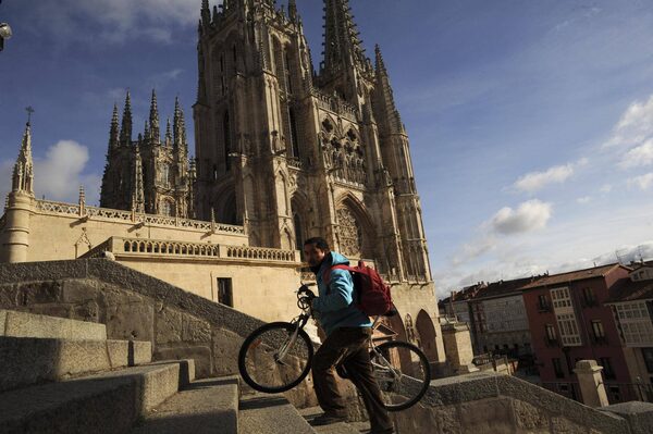 A man with a bike is walks in front of Burgos Cathedral in Burgos, Spain, Dec. 21, 2012.GUILLERMO CERVERA/The New York Times