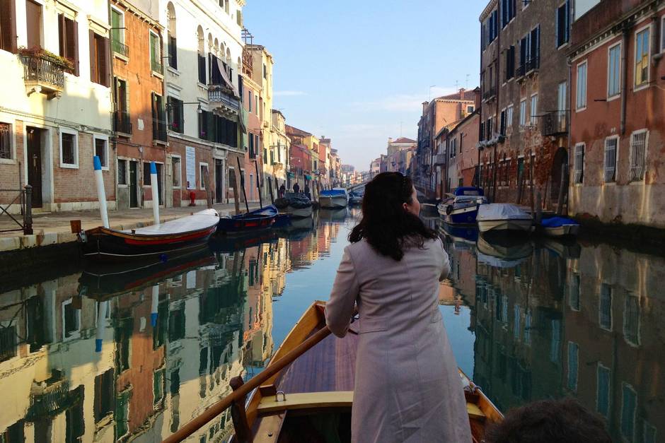 “Short your oar,” she called to my daughter, who pulled in her oar as we turned into a narrow waterway and slipped in behind another shrimp-tailed rowboat with a group of twentysomethings heading to the bars. Washing hung to dry over our heads and Sofia had to use her leg to push us off the canal walls to keep moving. A motorboat of grumbling teenagers got stuck behind us and began harassing her about the “touristas” taking too long; she shot back in Italian as good as she got.