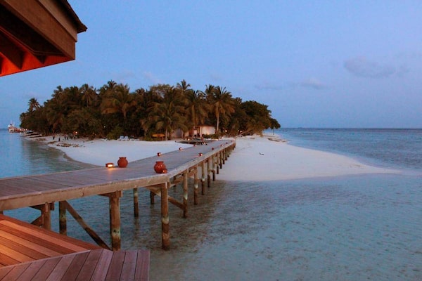 Vilamendhoo is tiny: You could probably throw a coconut from one side to the other. Its elevation is barely one metre above sea level, and it takes 20 minutes to walk around the whole island, which is exactly how long it takes to consume a pina colada. As we stroll along the beach in the fading light of our first sunset, we can see the outline of the fringing reef tracking the edge of the island several metres from shore.
