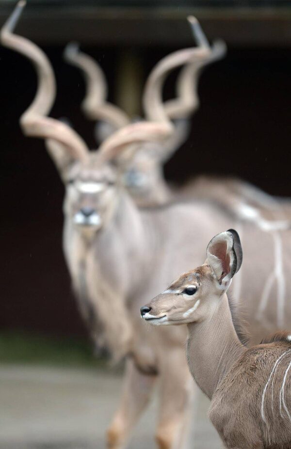 A young kudu is pictured in front of grown-ups at their compound in the zoo in Duisburg, Germany, Friday, April 26, 2013. The animal was born in January 2013.Federico Gambarini/The Associated Press