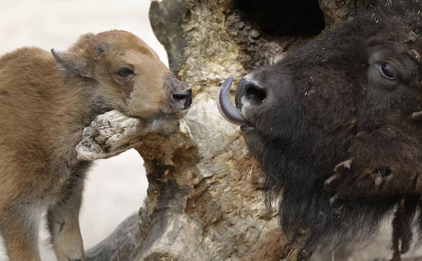 New born bison Bela stands next to its mother, Nadine, at their enclosure in the zoo in Berlin, Germany, Friday, May 3, 2013. Bela was born on Sunday, April 28, 2013.Michael Sohn/The Associated Press