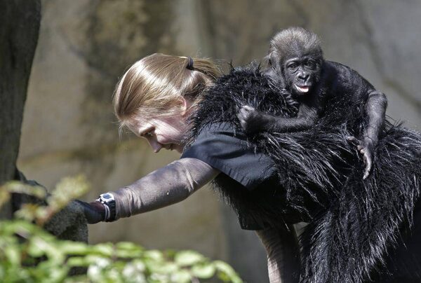 Ashley Chance carries a three-month-old western lowland gorilla named Gladys at the Cincinnati Zoo on Tuesday, April 30, 2013, in Cincinnati. The baby gorilla was born January 29 at a Texas zoo to a first-time mother who wouldn’t care for her.Al Behrman/The Associated Press
