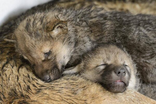 Two one-month old baby wolves rest on their mother, Mara, in the zoo de La Garenne, in Le Vaud, Switzerland, Friday, May 3, 2013.Laurent Gillieron/The Associated Press