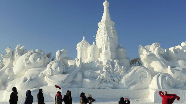Tourists take pictures in front of a snow sculpture ahead of the 13th Harbin Ice and Snow World in Harbin in China.SHENG LI