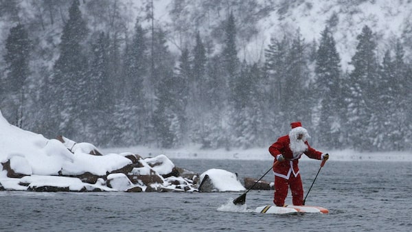 Nikolai Vasilyev water-skis while dressed as Santa Claus along the Yenisei River outside Russia's Siberian city of Krasnoyarsk December 22, 2011.ILYA NAYMUSHIN