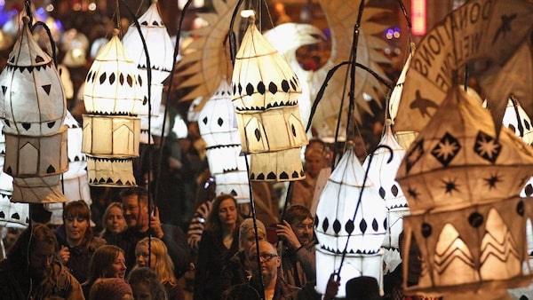 People carry lanterns at the Burning The Clocks Festival on December 21, 2011 in Brighton, England. The annual celebration is enjoyed by thousands of people who carry paper lanterns through the streets of Brighton culminating on Brighton Beach where the lanterns are burnt and the Winter Solstice is marked.