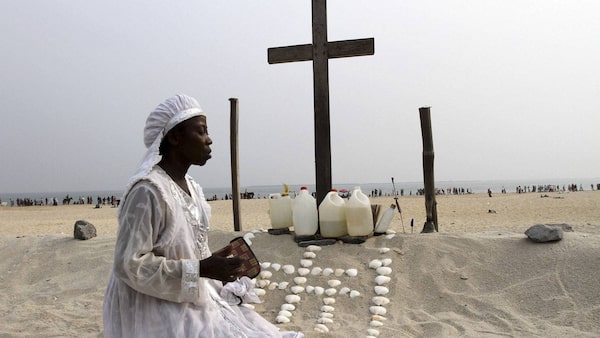A member of white garment Christian sect prays by a cross at the bar beach, where they live and worship in makeshift tents, in Lagos December 25, 2011.AKINTUNDE AKINLEYE