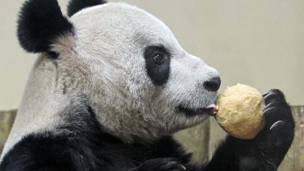 Tian Tian licks her 'panda cake' in her enclosure at Edinburgh Zoo in Scotland, on Christmas Day.Andrew Milligan