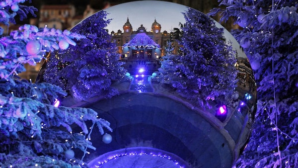 Monte Carlo casino is reflected in a mirror between Christmas trees in Monaco.