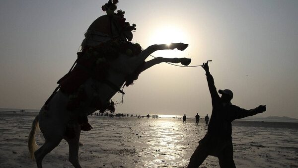 A Pakistani horse owner tries to control his horse while he waits for customers at Clifton beach in Karachi, Pakistan.Fareed Khan