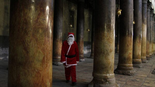 A Palestinian Christian dressed as Santa Claus walks through the ancient columns in the Church of the Nativity in the biblical West Bank city of Bethlehem.