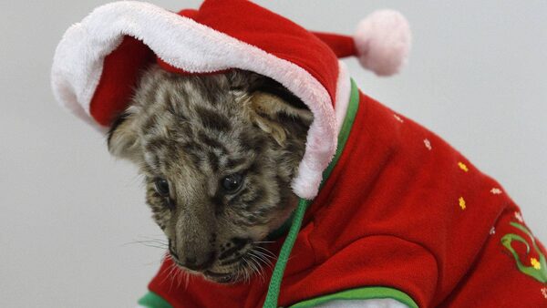 A tiger cub dressed as Santa Claus is seen on Christmas Eve at the Sriracha Tiger Zoo in Thailand's Chonburi province.