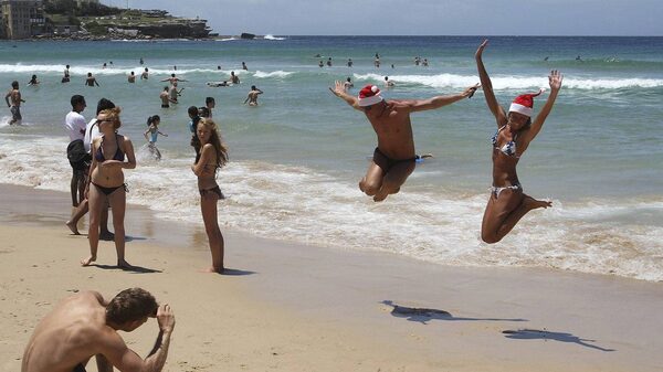Beach goers jump in the air for a photo as they celebrate on Christmas Day at Bondi Beach in Sydney, Australia.Rob Griffith