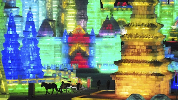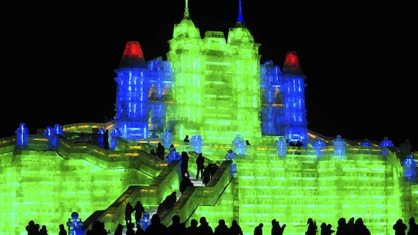 Tourists visit ice sculptures during the the lights testing period of the 13th Harbin Ice and Snow World in Harbin in China.SHENG LI