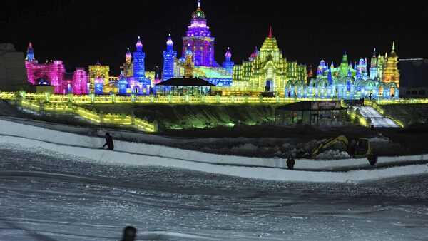 A snow slope near ice sculptures during the lights testing period of the 13th Harbin Ice and Snow World in Harbin in China.SHENG LI