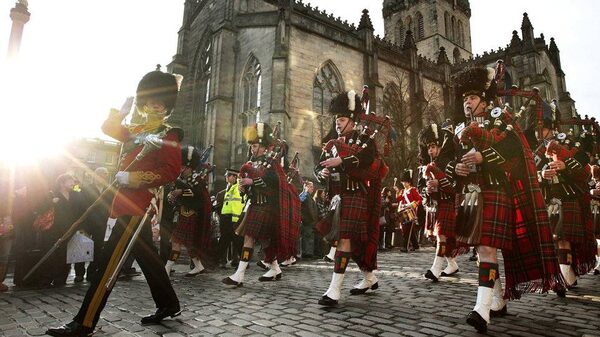 The pipe band from the British Army's Royal Scots Dragoon Guards regiment march past St. Giles Cathedral in the Royal Mile during a homecoming parade in Edinburgh, Scotland on December 1, 2011.DAVID MOIR