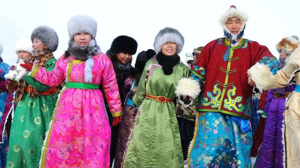 Mongolians wear tribal costumes to impress tourists during the winter Naadam festival in Hulun Buir, north China's Inner Mongolia region, on December 2, 2011.STR
