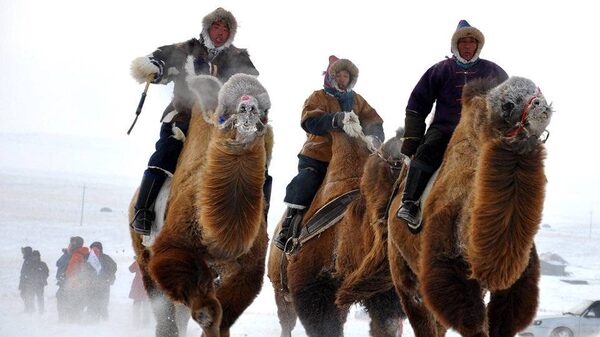 Mongolian tribesmen take part in a camel race during a winter Naadam festival in Hulun Buir, north China's Inner Mongolia region on December 2, 2011, in the latest event to promote tourism in the cold winter months.STR