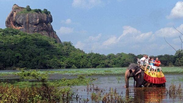 Foreign tourists ride an elephant during a sightseeing tour in the ancient city of Sigiriya on December 2, 2011. The number of foreign tourists visiting Sri Lanka has swelled since the island ended a 37-year separatist conflict with Tamil Tiger rebels.ISHARA S.KODIKARA