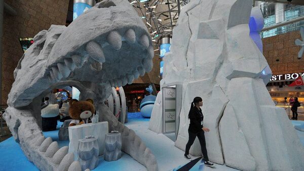 A worker walks Christmas decorations at a shopping mall in the Mong Kok region of Hong Kong on December 6, 2011. Shopping malls in the city are showcasing extravagent holiday decorations in an attempt to attract customer traffic.AARON TAM