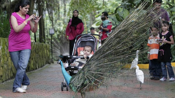 Tourists attempt to photograph an Indian blue peafowl at the Kuala Lumpur Bird Park, Malaysia, Monday, Dec. 5, 2011. The park houses more than 3,000 birds representing more than 200 species.Mark Baker