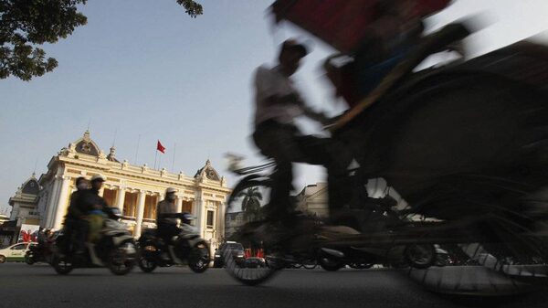 A man transports tourists on a three-wheel cyclo past the Hanoi Opera House December 2, 2011. A total of 5.42 million foreigners visited Vietnam in the first 11 months of this year, a rise of nearly 18 per cent from a year earlier.KHAM