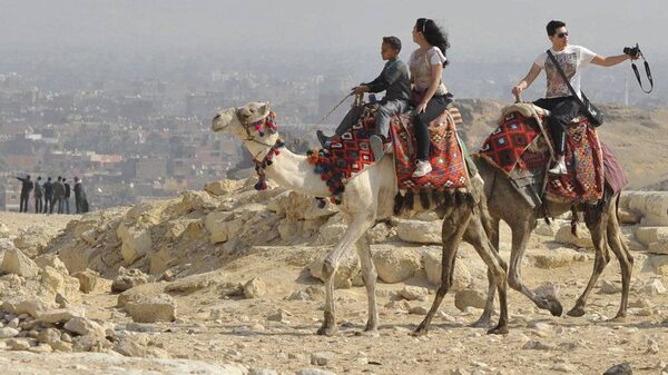 A tourist takes a photo of himself during a family camel ride at the Giza pyramids near Cairo, Egypt, Saturday, Dec. 3, 2011.Bela Szandelszky
