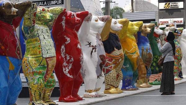 A woman views the United Buddy Bears outside a shopping mall in Kuala Lumpur, Malaysia, Wednesday, Dec. 7, 2011. The United Buddy Bears are on a world tour to promote living together in peace and harmony.Lai Seng Sin