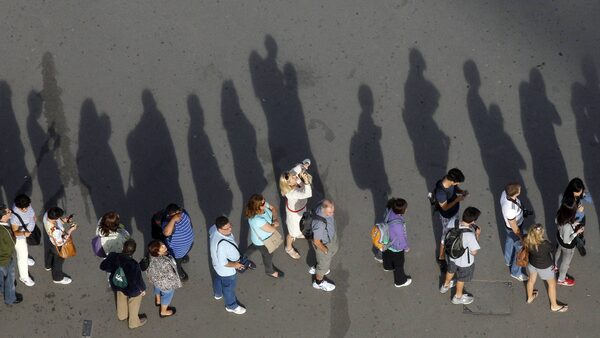 Shadows are cast on the ground as people line up to enter the Eiffel Tower in Paris September 27, 2011.BENOIT TESSIER
