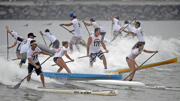 Stand-up paddleboarders catch a wave at the Battle of the Paddle race at Doheny State Beach on Saturday, Sept. 24, 2011, in Dana Point, Calif. Competitors paddle through the surf, run a beach course and paddle around buoys during the race.DENIS POROY