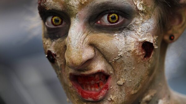 This Thursday, Sept. 22, 2011 photo shows an actor in costume and makeup as she poses in her setting at the House of Shock, a haunted house, in New Orleans.Gerald Herbert
