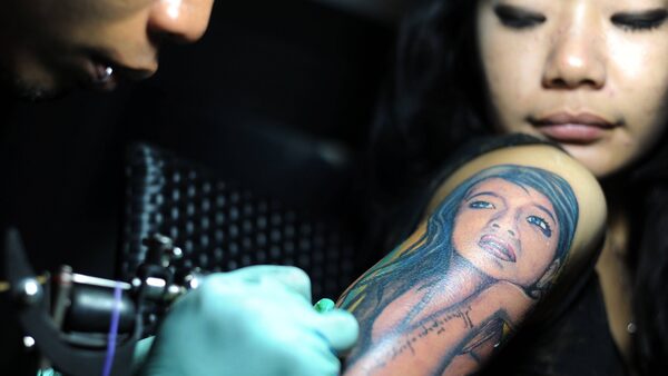 In a picture taken on September 23, 2011 an artist tattoos the arm of a client during a tattoo festival at Legian Kuta on Indonesia's resort island of Bali. The festival is designed to promote tourism on the resort island.SONNY TUMBELAKA