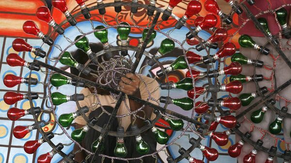 A man installs coloured bulbs on an iron frame to be used in a circus decoration in Noida, on the outskirts of New Delhi, September 26, 2011.PARIVARTAN SHARMA