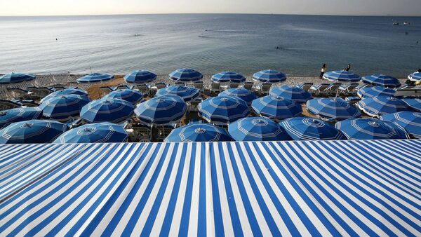 People swim in the Mediterranean Sea as blue beach umbrellas provide shade from the sun along the beach in Nice, southeastern France, Tuesday, Sept. 27, 2011.Lionel Cironneau