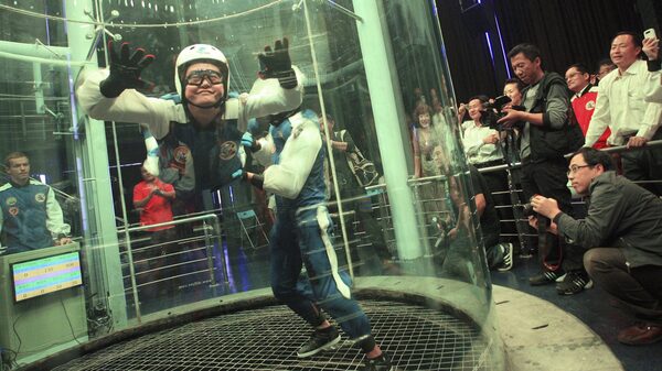 A woman floats with the help of an instructor inside a vertical wind tunnel for visitors to try a body-flying experience at a tourist resort in Dalian, Liaoning province September 27, 2011.CHINA DAILY