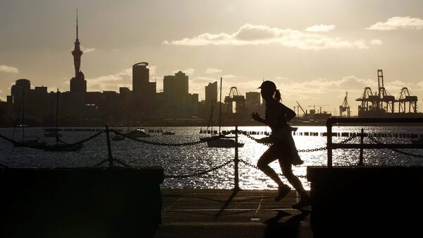 A jogger runs along the seawall in Auckland September 26, 2011, with the city skyline in the background.STEFAN WERMUTH