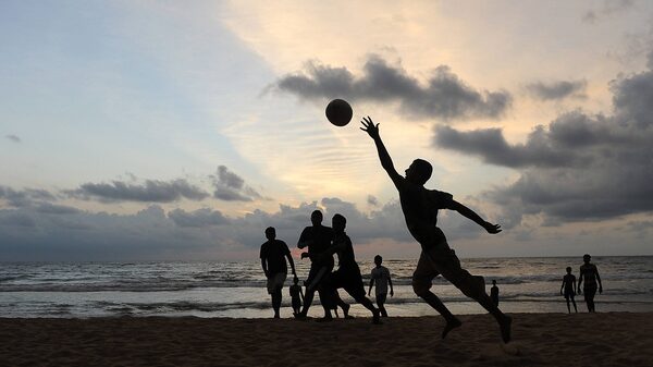 Sri Lankan youth play Rugby on a beach in Colombo on September 27, 2011. Widely known as the Pearl of the Indian Ocean, the island of Sri Lanka is endowed with over a thousand miles of golden beaches.LAKRUWAN WANNIARACHCHI