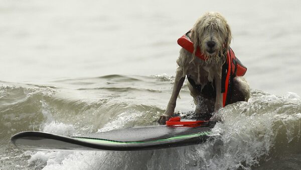 A dog rides a surfboard at a surf dog contest in Huntington Beach, California September 25, 2011.LUCY NICHOLSON