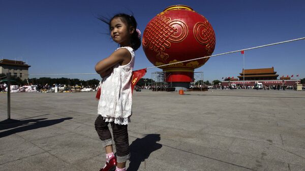 A girl poses for a photo in front of a giant red lantern on display at Tiananmen Square for the upcoming National Day celebrations on October 1, in Beijing September 22, 2011.JASON LEE